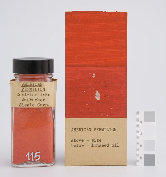 Curator: This captivating pigment, "Vermilion (English)," was manufactured by F. Weber & Company. It's basically a historical artifact of color! Editor: The boldness is immediate. The color really pops. It’s the color of revolution, of vitality… but also, considering the mercury content, of danger. Curator: Precisely! Vermilion has this incredible history—being both prized and perilous. The label’s stark typography also speaks to a very different era of art supply. Editor: Absolutely. It brings up questions about material access, industrial processes, and, of course, the artist's relationship with their tools. We are so detached from the means of creating art nowadays! Curator: It’s almost like a relic, isn't it? I can imagine some artist from back then, carefully mixing this color and dreaming of masterpieces. Editor: It makes me reflect on labor, risk, and how we value the art object over the often-unseen processes that make it possible. Curator: That's an angle I had not considered. Now I see this pigment with new eyes.