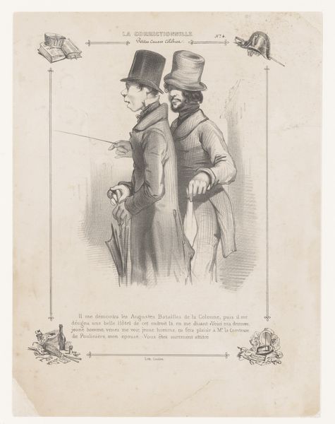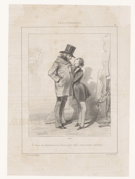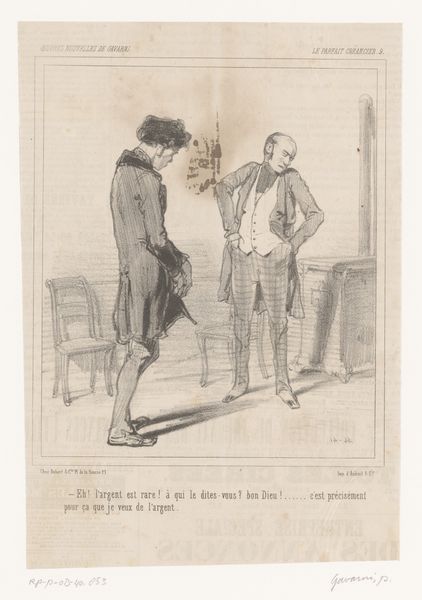 Paul Gavarni made this print, “Two Men Talking about a Creditor,” in nineteenth-century France, a time of significant social and political change. Gavarni was known for his satirical commentary on Parisian life, and this work is no exception. Here, Gavarni captures a moment of whispered conversation between two men, likely discussing financial matters and obligations. Their clothing and demeanor suggest they belong to the bourgeoisie, a rising class marked by aspirations of wealth and status. We might consider how the weight of economic pressures affected social interactions and personal reputations. The men are caught in a candid moment, hinting at the hidden anxieties beneath the surface of polite society. Gavarni invites us to consider the emotional and psychological impact of financial strain on individuals navigating a rapidly changing world.