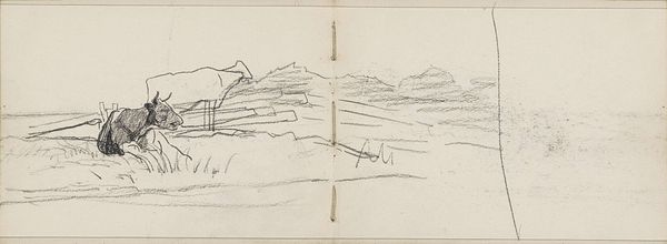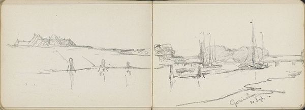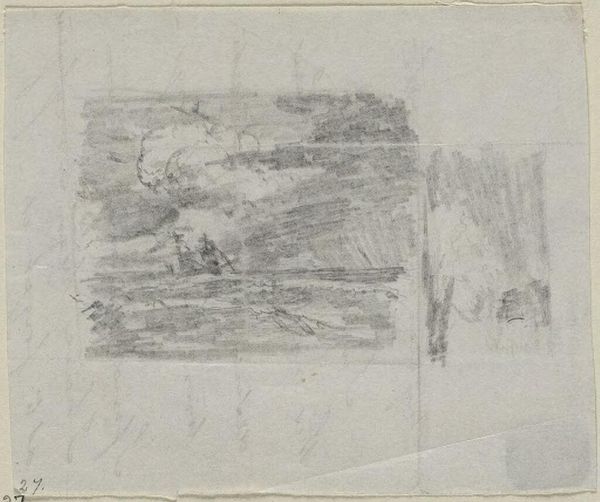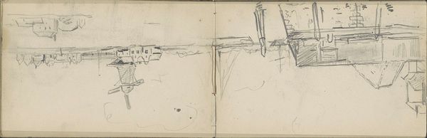 Curator: Welcome. Here we have George Hendrik Breitner’s “Compositiestudies en een boot,” created between 1881 and 1883. It’s currently held here at the Rijksmuseum. Editor: My first impression is how tentative it feels. It has the quality of a quick observation, a snapshot of a moment. The grey pencil lends itself to that transitory feel. Curator: Absolutely. The use of pencil emphasizes its status as a preliminary study, focusing our attention on the composition and arrangement of forms. Note how Breitner explores spatial relationships and the placement of the boat. Editor: The boat—yes. Considering Amsterdam's history as a port city, one has to consider the boat here not only as an object, but also as a reflection of the city’s socio-economic identity and colonial ties at that moment. The very sketchy treatment here invites speculation—is the boat a harbinger of industry and trade, or an ominous emblem of unequal exchange? Curator: That’s an intriguing point, and the boat’s haziness gives pause for that interpretation. However, the rapid lines also direct us to consider Breitner's formal goals. He seemed interested in exploring multiple angles, rapidly capturing different points of view. This gives the drawing an almost cubist feeling, decades before that movement would emerge. Editor: Agreed. However, such depictions of labor are never neutral. We must also remember that sketches like these might also be viewed as artifacts of the artist's social standing, afforded the leisure to sketch while observing maritime laborers. Breitner came from a family of merchants. One needs to acknowledge that perspective. Curator: That said, the stark tonal variations and loose handling anticipate the impressionistic techniques he'd later employ. He focuses on shadow and light in their barest form. Editor: Yes. Overall, by encouraging curiosity about Amsterdam’s history, Breitner's sketch evokes broader themes surrounding work, trade, and cultural exchange. It also implicitly alludes to how that history disproportionately affected different parts of society. Curator: Thank you. I find that I’m compelled to see it now as more than simply a study—but as a preliminary moment to grasp historical perspective through the simple use of rapid, informal gesture.