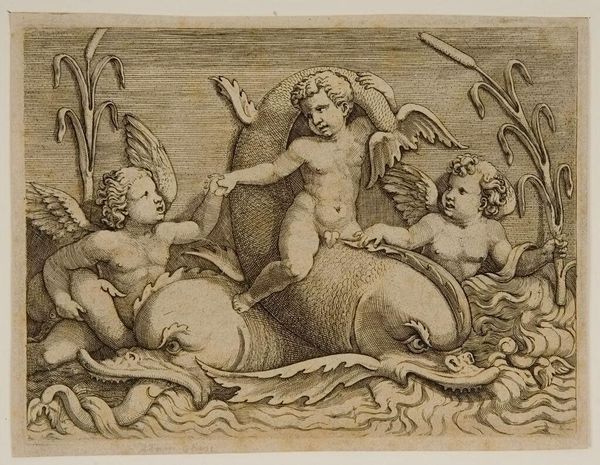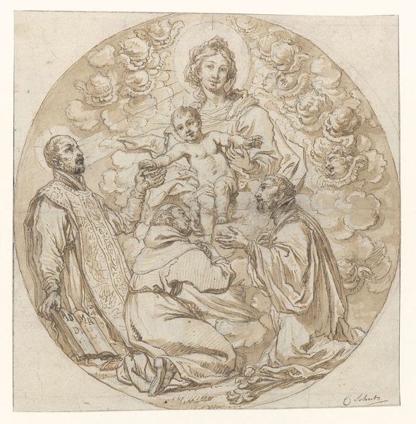 Editor: This is "Ceres with Horn of Plenty" by Crispijn de Passe, made around the late 16th or early 17th century. It's a small, circular drawing of a classical scene. What can you tell me about it? Curator: The materiality is key here. This is not a painting, but a drawing, likely intended for reproduction. Consider the labor involved in creating a design meant to be disseminated widely. How does this shift our understanding of its value? Editor: So, it's less about the individual artistry and more about mass production? Curator: Precisely. It's a commercial object, reflecting the burgeoning print market and the commodification of classical imagery. What do you make of the choice of Ceres as a subject in this context? Editor: I see. It makes me think about how art was becoming more accessible through these reproducible formats. Thank you!