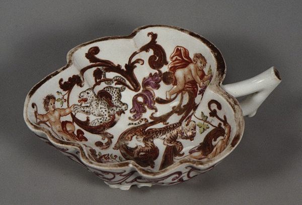 This porcelain cup was made by the Meissen Manufactory. Note how the form divides into two distinct visual registers. The lower section features a series of vertical bands in warm gold tones, punctuated by thin white lines. This rigid, almost architectural, structure provides a stable base, contrasting with the cup's upper portion. Here, we see delicate scenes painted in lilac monochrome, depicting classical figures amidst pastoral landscapes. These scenes create an ethereal, dreamlike quality. The cup's design invites us to consider the interplay between form and surface, structure and narrative. The rigorous geometry of the lower bands anchors the cup, while the fanciful scenes above evoke a sense of lightness and movement. The juxtaposition creates a dynamic tension, drawing our eye around the cup and encouraging us to contemplate the relationship between utility and decoration, order and imagination.