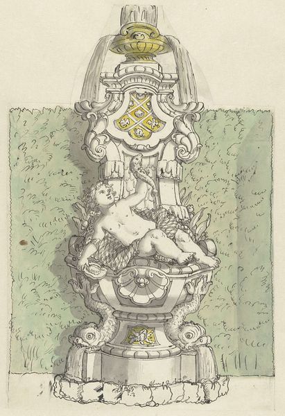 Curator: Here we have a print entitled “Vierkant bassin met halfronde uitstulpingen,” or “Square basin with semi-circular bulges.” It’s an engraving and etching likely dating back to 1664, created by an anonymous artist. Editor: Well, my first thought is how wonderfully impractical it seems. The little statues in the middle getting drenched! There's a playful theatricality to the architecture of water here, wouldn't you say? Curator: Indeed. The artwork presents an idealized image, encapsulating classicism and Baroque elements within a garden setting. Fountains in this era were much more than ornamentation. They reflected control, prosperity, and often carried strong symbolic value related to cleansing and purification. Editor: It makes me think of Versailles! And this idea of taming nature and bending it to human will. It’s really striking. All these meticulously placed objects and controlled water. But what’s with those face masks at the basin? Do they spout water, too? Curator: Quite possibly! Faces, masks, and grotesque features often adorn fountains and architectural elements, sometimes associated with spirits of nature or deities linked to water. It would represent nature being tamed. Also, consider the basins and urns—they signal abundance. Editor: So, it’s not just showing a pretty place but communicating this entire philosophical view. A vision of human dominance, filtered through classicism. But isn't it a little cold? Despite all the apparent luxury, there’s something... distant about it all. Curator: I see your point. There's a formality inherent in the visual language of power. That distance reminds viewers of a hierarchy. The statue with the water cascade on the head represents the submission of the common folk by the governing body, represented here through a higher form of art: the sculpture. The cascading fountain turns the water into strings that seem to connect, which is a sign of commitment to maintaining that connection by any means necessary. Editor: What a chilling notion! But there you go – a pretty garden concealing a coded message. I am more glad than before that gardens and water basins have changed so much from then on. Curator: Precisely! And in these kinds of prints, the fusion of art, engineering, and social messaging becomes remarkably clear. It mirrors what art means to us nowadays too!