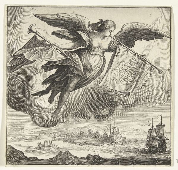 Curator: Here we have Johann Sadeler I's "Allegory of Fame," created sometime between 1560 and 1600. It's an engraving currently held here at the Rijksmuseum. Editor: It’s striking how the crisp lines of the engraving almost give the figure a metallic feel. It's both ethereal and grounded, if that makes any sense. What was the intended audience and reception for engravings such as this? Curator: This piece participates in a tradition of allegorical representations in art, meant for educated, elite audiences, as prints at the time facilitated the broader distribution of such imagery beyond painting commissions. Allegory, of course, employs symbolic figures to represent abstract concepts. Note how Fame is elevated—literally sitting above the world. Editor: Right, sitting on top of a cloud looking down at the world beneath her. This focus on the earth—is it a comment on colonialism and a rapidly changing, increasingly globalized world during that time period? And I am thinking about the artist as a maker as well, how could we describe this period of intense global transition and artistic transformation? Curator: Well, the power of representation certainly mirrors Europe’s increasing world power. As an engraving, the labor put into carving the matrix for printing highlights both skill and reproducibility. This would permit widespread viewership within courtly and intellectual circles and allow for standardization of images to portray status and authority. The material nature of printmaking speaks to a wider network of artisans beyond the "fine arts." Editor: It is interesting to consider the printing, almost as mass production, of an allegorical figure such as fame. With her trumpet, it’s a visualization of propaganda. This suggests how readily images can construct reputations—raising some figures while silencing others through very material processes of reproduction and distribution. Curator: Exactly! The act of engraving itself becomes a medium of power—carefully shaping perceptions and reinforcing socio-political hierarchies in an expanding, increasingly visually driven world. And the distribution of these images helps construct the reputation of the artists involved as well. Editor: In a way, it is not that different today; it gives one pause to reflect on contemporary image production and circulation. So thank you, Johann Sadeler I, for making the perfect item for introspection! Curator: A telling image indeed, offering insights into both art and society of the early modern period.
