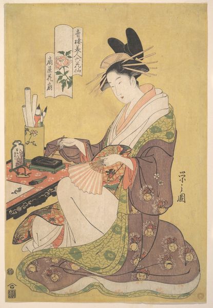 Curator: Chōbunsai Eishi, a prominent artist of the late 18th century, created this serene woodblock print titled "Hotei, from the series 'Comparison of the Treasures of the Gods of Good Fortune.'" What captures your eye about it? Editor: Immediately, the tranquility of the scene strikes me. There’s a softness to the colors, the posture of the figure. It feels like a moment of quiet contemplation, a stark contrast perhaps to the bustling city life of Edo. Curator: The choice to depict Hotei, typically a male figure associated with abundance and contentment, as a graceful woman is fascinating. Do you find that change particularly significant? Editor: Absolutely. This re-gendering challenges conventional representations of fortune and success in ukiyo-e art. It begs the question of who is granted access to prosperity and happiness within that society. Perhaps Eishi is subtly questioning the male-dominated narratives of his time. Curator: Notice also the objects surrounding the figure: the scroll, the table laden with treasures. What symbols do these items hold for you? Editor: Well, the scroll presents a symbol of divine blessings with its accompanying image of Daikoku's rat. These objects represent abundance, linking her presence to tangible manifestations of wealth. Also, it highlights how Hotei brings the power and influence associated with wealth in a patriarchal setting to a figure who usually doesn't carry such power. Curator: Precisely, the treasures echo the series’ exploration of the Fukujin—the gods of good fortune. Eishi uses recognizable motifs but subverts them to create new meaning. This tension, do you agree it heightens the visual experience? Editor: Definitely. It prompts a more thoughtful consideration of these symbols, rather than accepting them at face value. This is more than just a pretty image; it's an invitation to question assumptions. The gentle pastel palette enhances this further by invoking feelings of domesticity to make its implicit socio-political themes all the more subversive. Curator: So, the choice to soften both form and meaning… a fascinating act of empowerment via redirection! It reflects how artists of this period creatively commented on the existing social norms. Editor: Exactly! The power of subtle disruption—it is something worth considering!