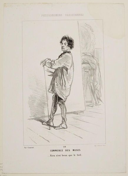 Editor: Here we see Honoré Daumier's lithograph, "Three O'Clock in the Morning, He's Ready to Enjoy the Pleasures of the Hunt." It's incredibly expressive, particularly the figure's exaggerated posture. What can you tell me about this work? Curator: Daumier’s lithographs were mass produced for newspapers. He wasn't creating singular "art objects" but engaging in social commentary through readily available, reproducible images. Consider the labor involved in printing, the distribution networks, and the consumption of these images by the bourgeoisie he critiques. Editor: So the very means of production are part of the message? Curator: Precisely! The availability of prints allowed his criticism of bourgeois life to reach a wide audience. Editor: That gives me a lot to consider about the piece. Thank you. Curator: Indeed. It's a fascinating look at art, production, and social commentary.