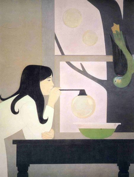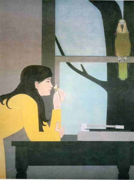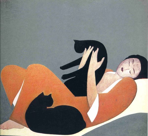 Editor: This is a painting by Will Barnet – title and date unknown – featuring a woman and a cat in muted blues and greys. The composition feels very still, almost frozen in time. What symbolism do you see here? Curator: The sleeping woman and cat present a potent image, almost like a secular Madonna and child. Observe the line connecting her hand to the cat; it reminds me of the thread of life or destiny, subtly linking the figures. Editor: That's interesting. So the cat represents destiny, perhaps? Curator: Not necessarily destiny itself, but perhaps a guardian of it, or a representation of the hidden, intuitive aspects of life. Cats often appear as symbols of intuition, and sometimes the feminine. Notice also how the window hints at an outside world, a contrast to the interior domesticity of the scene. What does that signify, do you think? Editor: Perhaps it signifies a connection to a reality that is inaccessible to these sleeping characters. It makes me wonder, what is beyond this space, outside of comfort and domesticity. Curator: Indeed! The painting operates in these dualities. And notice how geometric the shapes are – even the folds of her sleeves. There is so much memory of early Modernism present, even invoking a bit of Cubism in how the picture is rendered, despite the realist subject matter. How do these aspects interplay with the figures depicted? Editor: Now that you point it out, the angularity really adds a sense of constructed stillness, reinforcing the sense of being frozen in time. It adds another dimension to how I was perceiving the interior domestic space, as not necessarily passive. I appreciate these subtle dualities and contrasting symbols we explored here.