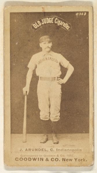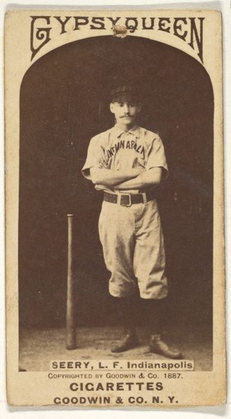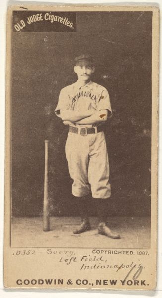 Editor: Here we have "Seery, Left Field, Indianapolis," a baseball card from the Old Judge series, printed in 1887. The company was Goodwin & Co. It seems to be a photographic print. I find it interesting that they made these as advertisement for cigarettes. What is your interpretation of this artwork? Curator: For me, the card’s value resides less in its depiction of an individual player, but in its role as a mass-produced object, circulated through the commodity culture of the late 19th century. Consider the layers of production: the player’s labor, the photographer’s craft, the printing process itself, and finally, the packaging and sale of cigarettes. Editor: That's interesting. I hadn't really thought about it that way. It's not just about baseball; it's about how things were made and sold. Curator: Exactly! Notice how the "Old Judge Cigarettes" logo dominates the top of the card. This isn't simply a celebration of athleticism, but a calculated marketing strategy, leveraging the burgeoning popularity of baseball to push another product. What does the inclusion of “copyrighted” on the card tell us about commodification of images at this time? Editor: It suggests control, right? Protecting their investment in both the photograph and the player's image to prevent unauthorized reproduction and sale. So the card itself becomes a form of currency. Curator: Precisely. And that makes you think of the relationship between tobacco production, mass media, and the rise of professional sports. It is fascinating how materials tell the stories about our lives, doesn't it? Editor: Absolutely! Seeing it as a product of its time, enmeshed in commerce and copyright, rather than just a picture, has completely changed my perspective. Thanks!