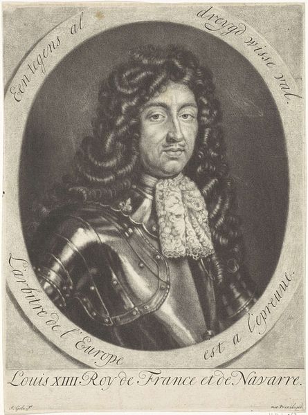Curator: Let’s delve into this commanding portrayal. What strikes you first about it? Editor: The overwhelming theatricality! It’s impossible to ignore that cascade of curls, or the sheer weightiness conveyed by the armour. There's something performative, even constructed, about the image itself. Curator: You've picked up on the essence of Baroque representation. This engraving by Pieter Schenk, likely created sometime between 1670 and 1713, is entitled "Portret van Lodewijk XIV, koning van Frankrijk"—Portrait of Louis XIV, King of France. Considering Louis XIV’s historical positioning, the staging feels purposeful, wouldn't you agree? The absolute monarch as a brand, carefully managed through visuals like this. Editor: Absolutely. Notice how the armour is practically overflowing into the frame, as though the very instruments of power can barely contain the king’s persona. Even in an engraving, the material presence dominates. What does the choice of armour signify, beyond straightforward strength? Curator: It signals, perhaps ironically, a connection to the past—to a tradition of royal might rooted in martial prowess. At the same time, by the time this portrait was likely made, the power of the monarchy was arguably maintained more through its court at Versailles than on the battlefield. It’s a clever layering of signifiers. The very conscious building of the Sun King mythology! It is Baroque aesthetic, but beyond that, it reflects specific contemporary ideologies of governance and self-representation, positioning Louis as central to French, and arguably, European identity. Editor: Yes, there’s such deliberate manipulation of symbolism here; Schenk invites the audience to interpret, and, by interpreting, participate in the cultural mythmaking around Louis XIV. A canny propaganda exercise packaged within portraiture. And look—even in this medium, you can practically sense how it was carefully intended to broadcast power through repeatable, reproducible imagery. It shows the dawn of the age of reproducible image and propaganda, but still so beautifully ornamented! Curator: Precisely! It shows how images act as active agents of cultural memory. This image makes me think about the narratives we keep alive—who is included, who is erased, and what are the cultural implications. Editor: And on that note, perhaps it prompts us to examine the symbols we are still crafting today…