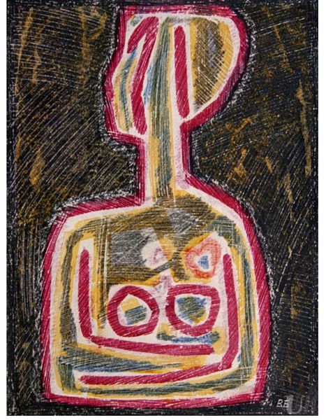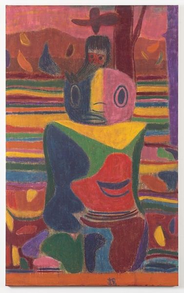 Curator: Looking at "Flowers in Stone" from 1939 by Paul Klee, I can’t help but feel a strange sort of grounded joy emanating from it. It’s in the Galerie Rosengart collection, and quite a powerful piece when viewed in person. Editor: Yes, “grounded” is right! The ochre and earth tones give it a sturdy feeling, despite the whimsy of the… flowers? Or are they coded messages? And what’s up with those brick-like structures at the bottom, giving it a wobbly kind of footing! Curator: Perhaps Klee wanted to give us a sense of weightiness. The geometric and letter-like symbols almost fossilize them, setting off their natural fluidity. And consider that this was painted on burlap, of all things! A really coarse texture. Editor: Burlap… intriguing. He's elevating a very common, rough material into something precious. Almost alchemic. But why burlap in '39? Was he playing with ideas of labor, of craft versus high art in a Europe heading for chaos? Curator: That's a compelling point! Perhaps it was his attempt at democratizing art, bringing a sort of earthiness that connected viewers more intimately to the work, something… unpretentious? But speaking of democratizing – look at those childlike shapes floating within the floral “head.” Do they represent humanity somehow? Editor: Interesting… though for me, those primal shapes and marks undermine any idea of an innocent, childlike aesthetic. They look… coded, almost aggressive in their simplicity. What processes, what labor was concealed to bring this work forth! I’m also trying to work out why he made the frame so integrated with the piece – it isn't the limit, it continues the art. Curator: Yes, Klee consistently defies boundaries, doesn't he? He beckons us to find the beauty in simplicity and the subtle layers that create depth. It's quite thought-provoking. Editor: Indeed. By decentering "high" material, Klee challenges us to find meaning and value where we least expect it: the overlooked, the common. In its way, it allows art to speak of precarity and resilience during that unsettling time.