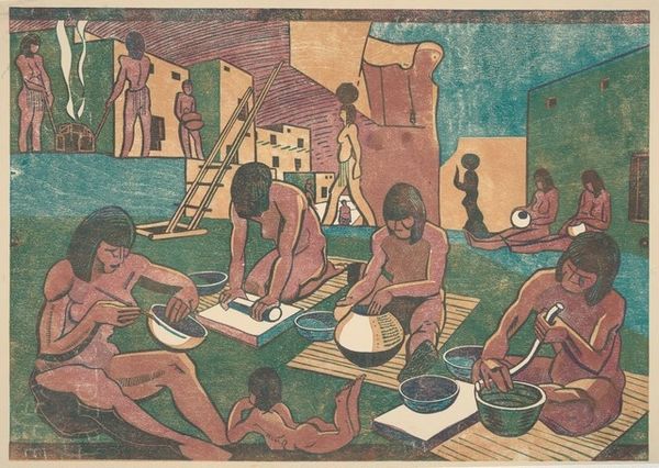Editor: Here we have an untitled oil painting by Arman Manookian. The style seems somewhat naive, but with distinct leanings towards Indigenous American and Orientalist art. What strikes me first is the way the artist renders this seemingly everyday scene, a gathering, in this earthy, vibrant palette. What do you see in this piece? Curator: What catches my eye is how Manookian uses a universal visual language to represent what is perhaps an intimate, culturally-specific moment. Note how the composition mimics the Golden Ratio; the figures arranged as though consciously aware of being within this artistic framework, blending Indigenous art and culture with early 20th-century aesthetic conventions. Are they posed, or are we, the viewers, merely seeing them that way? What memory do these shapes trigger in you? Editor: The reddish-brown skin tones connect to the background, merging the people and their environment. Do you think there's a symbolic intent there? Curator: I do. This is not simply a depiction but a deeply ingrained symbolism: the red-earth as ancestral ground, source and soul. Notice, too, the stark whiteness of the tree; is that absence a commentary on how these ancestral relationships were challenged, disrupted by colonial influence? How do you interpret it? Editor: It could represent that disruption. Also, this art has the aesthetic features of mural painting and a focus on conveying Indigenous themes. What underlying psychological implications might there be from mixing all these styles, themes, and media? Curator: A cultural negotiation, a weaving together of identities through visual cues. Manookian seems intent on constructing, or perhaps reconstructing, cultural memory by subtly intertwining various symbols within an accessible aesthetic. Editor: That's fascinating, understanding how diverse iconographies intersect to reflect cultural experience! Curator: Exactly. It really makes one reflect upon how visual representation both preserves and evolves under pressure.