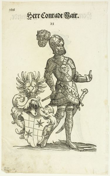Editor: Here we have Jacob Binck's "The Standard-Bearer," a drawing or print made sometime between 1520 and 1569. I'm struck by the figure's rigid pose and the incredibly detailed rendering of his clothing and armor. How do you approach analyzing this engraving? Curator: I would begin with an analysis of its formal structure. Notice how Binck employs line. The density of lines creates value and form, especially noticeable in the textural variations across the figure’s garb. What semiotic interpretations can be drawn from this linear complexity? Editor: Well, all that detail, the hatched lines defining form, convey weight and richness... prestige, even? Curator: Precisely. Let us consider the function of this abundance. The figure is adorned in highly embellished accoutrements; through the language of line, we interpret the construction of a privileged identity. What of the composition? Editor: He's placed squarely in the center, confident and imposing, taking up the whole frame. The background is really minimal, putting all the focus on him. Is it trying to say that the man is more important than his setting? Curator: Indeed. The relative austerity of the landscape concentrates visual attention on the figure. Note the interplay between positive and negative space contributes to the overall balance. How does the tension affect our interpretation? Editor: So, it's like he's elevated not just by his status, but by how Binck has structured the whole image. Everything draws our eye to him and tells us about his importance through shape, form, and line. Curator: You have astutely observed. By deciphering the internal logic of the composition, we arrive at a deeper appreciation of Binck’s artistic choices. The essence resides within the image. Editor: I will consider these insights moving forward, to analyze the intentional choices that form an artist’s style.