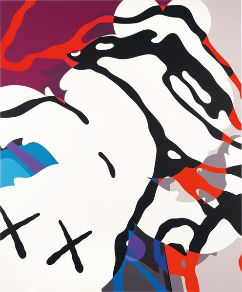 Editor: We’re looking at KAWS's "Vanquished" from 2016, made with acrylic paint. The bold colors and fragmented forms create such a striking initial impression, almost like looking at a disassembled puzzle. How do you interpret this work? Curator: The dynamic interplay between the fragmented, geometric shapes and the organic, biomorphic forms is key here. KAWS is exploring the tension between structure and fluidity. Note how the composition, though seemingly chaotic, is meticulously balanced. The artist’s mastery of color creates depth and directs the viewer's eye. The stark contrast amplifies this. Editor: So, the shapes aren’t random then? Curator: Precisely. Consider the black and white forms – they function almost as graphic symbols. We might analyze them using semiotic theory. The colors surrounding, against each, impact on how you interpret their forms and spatial dynamics. This invites an engaging process where observation itself is questioned. What relations can you discern between each? Editor: That makes sense. I hadn’t considered the symbolism within the shapes, or how the use of color contributes to a certain reading. The different perspectives help illuminate these dynamics further! Curator: Absolutely. Visual components function through mutual dependency. Now look at those thin, diagonal lines... Notice what the colors that border them emphasize. Editor: Thinking about visual art in terms of form helps move toward a complete understanding! Curator: Exactly, with consideration. There are no shortcuts!