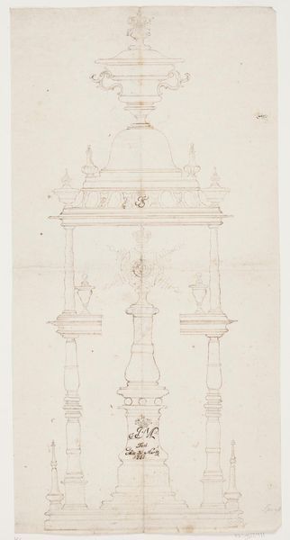 Curator: This drawing by Kenneth John Conant depicts a marble doorway in Eleanor of Toledo's rooms at the Palazzo Vecchio in Florence. It looks like a blueprint. The artist mapped out every detail, down to the decorative elements and moldings. Editor: You're right, it feels preparatory. But the doorway itself suggests a liminal space, a threshold between realms of power and privacy. Do the figures above the door reflect Eleanor's own story or aspirations? Curator: The imagery is classical, evoking a sense of timeless authority. The figures and ornamentation speak to Renaissance ideals, but, more importantly, to the Medici's carefully constructed image of themselves. Editor: Image-making through marble. The choice of material alone—marble, sourced, carved, and transported—demonstrates power and wealth. It turns architecture into a statement about the means of production. Curator: Indeed. It shows how symbols were used to shape a narrative. I see continuity in the classical allusions, an appeal to the values of past empires to legitimize the present. Editor: Looking at it now, the drawing itself becomes part of the story. Another layer of labor, adding to the ongoing interpretation of the Medici legacy.