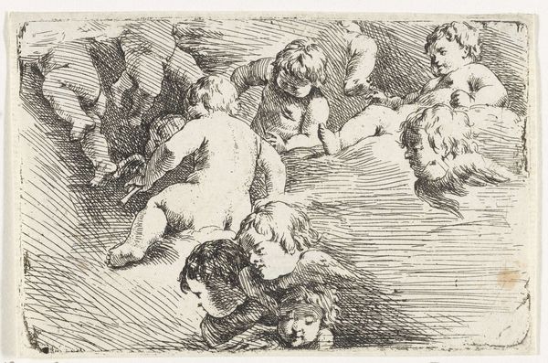 Jusepe de Ribera created this print, "Silenus by the Wine Vat," using etching techniques. Notice how Ribera masterfully employs line and form to create depth and texture. The composition centers on Silenus, the tutor and companion of Bacchus, reclining with a sense of inebriated abandon. Ribera uses the lines to define the contours of Silenus's fleshy body, contrasting it with the rough textures of the satyrs and the weighty wine vat behind him. This contrast serves to destabilize conventional notions of beauty and the ideal body. The use of light and shadow further enhances the drama, drawing our eye to the revelry and chaos of the scene. Ribera, through the sharp lines and the etching technique, captures not just a mythological scene but also engages with broader philosophical questions about desire. The print is not simply representational, it's an invitation to question and reinterpret classical themes through the lens of human experience.