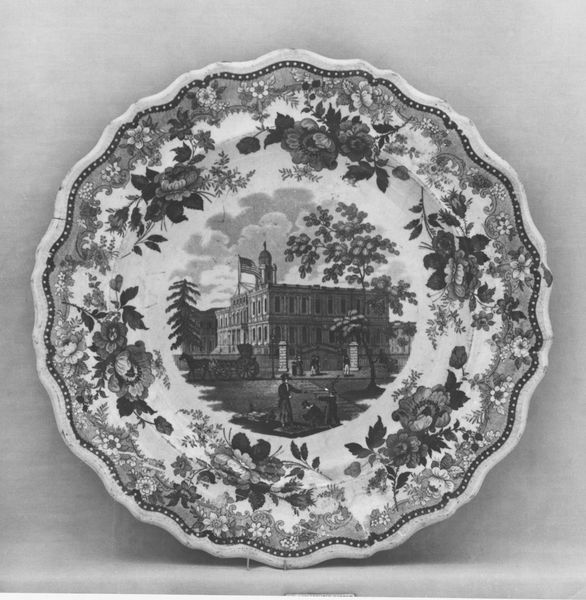 This platter was made by Job and John Jackson around 1830, from Staffordshire, England. It's made of earthenware, transfer-printed with a picturesque scene and floral border. The design was likely etched into a copper plate, inked, and then pressed onto thin tissue paper. This tissue was then carefully applied to the ceramic surface before firing, leaving a monochrome image. The process allowed for the mass production of decorated ceramics, making them accessible to a wider market. The Jackson brothers, like many Staffordshire potters, capitalized on the demand for affordable, decorative tableware in both domestic and international markets. The scene itself is a romanticized view of the American landscape, catering to a consumer base eager for exotic imagery. The platter embodies the industrial revolution, with mechanization enabling a global trade in ceramics, transforming both production and consumption. Considering the material and method, we see this platter as more than just a utilitarian object.
