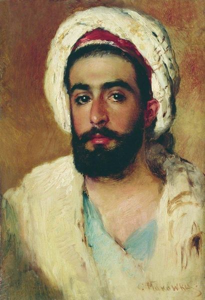 Editor: This is Vasily Vereshchagin's "Portrait Of A Jewish Merchant," rendered in oil paint. The gaze feels heavy, maybe a bit burdened. The coloring seems muted, almost like a memory fading around the edges. What do you make of this work? Curator: Fading memory... I love that reading. It *does* feel like a window into another time. Vereshchagin was fascinating – a war artist, but with a deep, humanistic streak. He wasn’t just interested in grand battles, but in the individual stories *within* them. Portraits like this one offer us, perhaps, a quiet pause, a reflective space away from all the battlefield clamor. Editor: That's really interesting. A quiet space amid the noise…So, is it simply documentation, then? Curator: Is *anything* ever *simply* documentation? Haha! Vereshchagin could’ve idealized, played with propaganda. Instead, there’s a dignity and depth of character here, don't you think? It begs you to construct the narrative of the man depicted, to consider the individual within a group that may have faced much hardship. Think about the *absence* of the grand narrative here; think about what this might communicate! Editor: You’re right, there's definitely a story etched in his face. The lack of grandeur makes it much more personal. I wouldn't have thought about that humanistic angle so distinctly without you pointing that out! Curator: See, that’s the joy of art – that collaborative seeing. To witness together, and to notice things unseen or perhaps only dimly recognized when witnessing separately, which perhaps echoes themes of unity. Editor: Exactly, learning to see with new eyes, expanding my own understanding. It's less about knowing, more about perceiving.