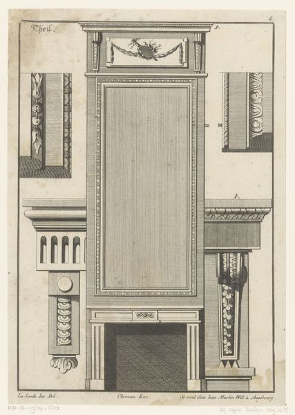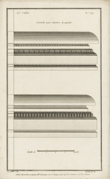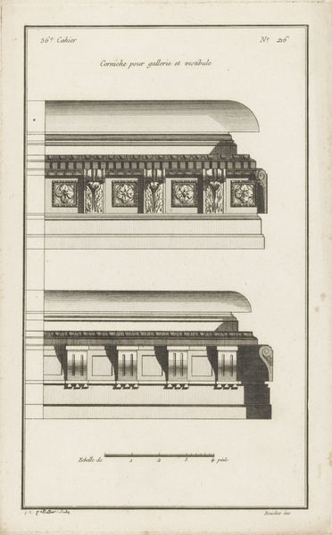 This is "Hoofdgestel en impost," a drawing made by Jean Pelletier. The artwork presents a study in architectural form through the use of precise lines and measured proportions. At first glance, you see two distinct architectural elements rendered with a muted palette, emphasizing structure over ornamentation. The composition is divided into two horizontal sections, each showcasing a different aspect of classical architectural detail. The upper section features a detailed entablature with modillions, while the lower section displays a curved impost, possibly from an arch. Pelletier’s technique highlights the interplay of light and shadow, achieved through fine hatching and cross-hatching that define the edges and suggest depth. What strikes me is how Pelletier's work embodies the Enlightenment's focus on reason and order, translating architectural theory into visual form. The drawing not only serves as a technical study but also as a statement on the cultural values embedded within classical architecture. This architectural drawing is an invitation to examine the foundational principles that shape our built environment.