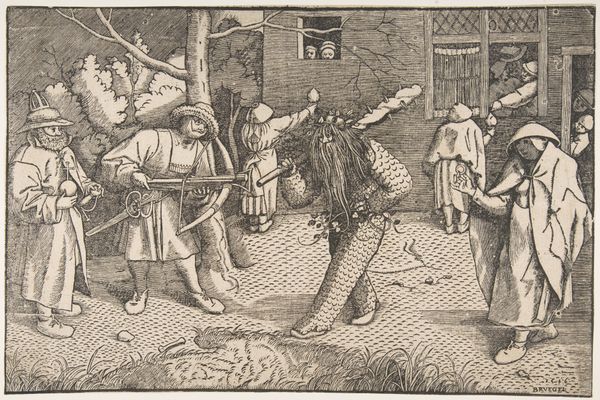 Curator: Immediately, I notice the dynamism—it feels very lively despite being an engraving. Editor: That's right. We're looking at an illustration from Adam Olearius’s book, “Persianischer Rosenthal,” printed in Schleswig in 1660. J. Muller created this print to accompany the text. It's a fascinating example of Baroque Orientalism, showcasing both genre and history painting. Curator: The contrast between the densely packed figures inside versus the ordered architectural space of the landscape is striking. The artist creates depth cleverly using linear perspective, even in such a small format. Look how the architecture dominates in the exterior. Editor: Yes, the architecture, along with the clothing worn by the figures, reveals quite a bit about the intercultural exchange of the time and place that fostered the production of this book. It’s fascinating how European audiences consumed ideas about the "Orient," largely shaped by works like this and travelogues. This image, serving as an illustration for a poem, itself served a commercial purpose. It was another commodity manufactured, circulated and consumed within Europe. Curator: Focusing on its composition, the scene's layout directs the viewer's gaze, moving from the enthroned figure on the left to the figures on the right, and eventually, drawing them into the receding planes of the outside spaces. It lends itself to storytelling—that visual narrative enhances its illustrative quality, working in symbiosis with the poem. The linear details are simply superb. Editor: And it is because of these images being included, as visual, and often spectacular, evidence that Olearius's book saw the level of success and popularity that it did. Muller’s engraving provided an experience of the poem through an intensified lens of perceived realness and verisimilitude for the European reader and potential investor looking toward foreign and profitable enterprise. Curator: That’s insightful. Thinking about line quality, detail, and spatial organization gives us clues into Muller's aesthetic preferences and his understanding of representing narrative scenes and history in the visual form, in this case in conjunction with the text. Editor: Indeed. When we examine its commercial function as it was situated historically, it also illuminates what kind of economic conditions shaped the very landscape and dissemination of visual culture at the time.