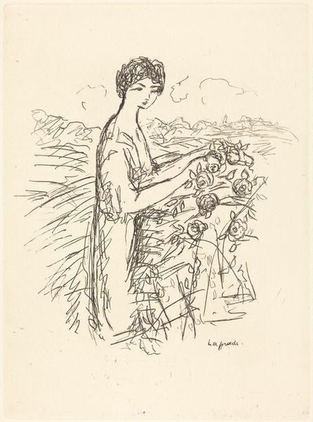 Pierre Laprade created "Woman Standing by an Open Window" using ink on paper. The drawing’s composition is immediately striking: the figure of the woman is framed by the stark geometry of the open window. Laprade’s use of line is particularly notable. Look at the sketchy, almost hurried marks that define the woman's form and the architectural details. These lines don't just describe; they create a sense of immediacy and movement. The open window offers a glimpse of the world outside, yet the woman’s contemplative pose suggests a detachment, a kind of self-containment. The window, with its strong vertical lines, acts as a visual barrier as much as a portal. This interplay of interior and exterior space, figure and architecture, creates a dynamic tension. The drawing prompts us to consider the relationship between the individual and their surroundings, the seen and the unseen.