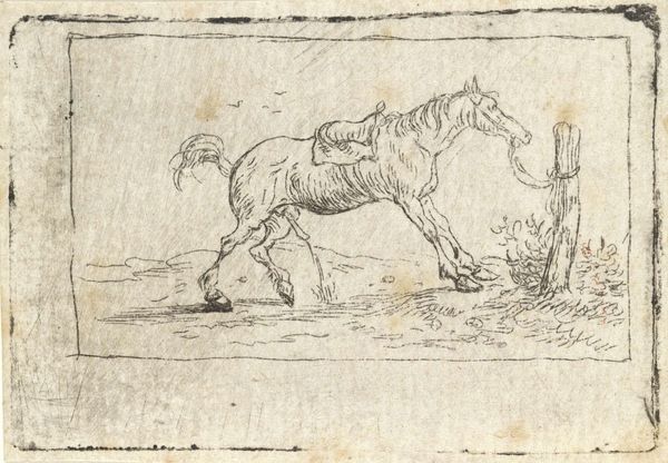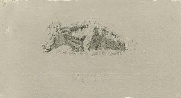 Editor: This is Gerrit Willem Dijsselhof’s "Tapir," dating from 1876 to 1924, housed here at the Rijksmuseum. It’s a quick pencil sketch, quite simple really. What can you tell us about it? Curator: Note the economy of line. The artist captures the essence of the tapir with minimal strokes. It’s in this restraint, this reduction to essential form, that we see the artist’s skill. Observe the tonal variations achieved through delicate shading. How do these gradations affect the sense of volume and form? Editor: They give it shape, definitely, make it less flat. But it also feels unfinished, like a study. Is it just about form and shading? Curator: Precisely! We can focus on the interplay between light and shadow and consider how it articulates the musculature and texture of the animal. Do you see how the directionality of the strokes contributes to a sense of movement? It is the synthesis of these elements that defines the drawing's aesthetic quality, its success as a purely formal exercise. Editor: So, by stripping away context and focusing on just the lines and shading, we get to the heart of Dijsselhof's skill in representing form? Curator: Indeed. We confront art's underlying structural language. What might appear 'unfinished' reveals an act of deliberate visual reduction. We're invited to contemplate the fundamental vocabulary of representation, the syntax of sight, the poetics of rendering itself. Editor: I see. Looking at it that way, I notice how the light falls and suggests movement a lot more. Curator: I am glad you noticed it. There is always much more to learn if you simply look closely at how elements are at play with each other. Editor: Thanks, I have really learned to appreciate this sketch from this formalist perspective.
