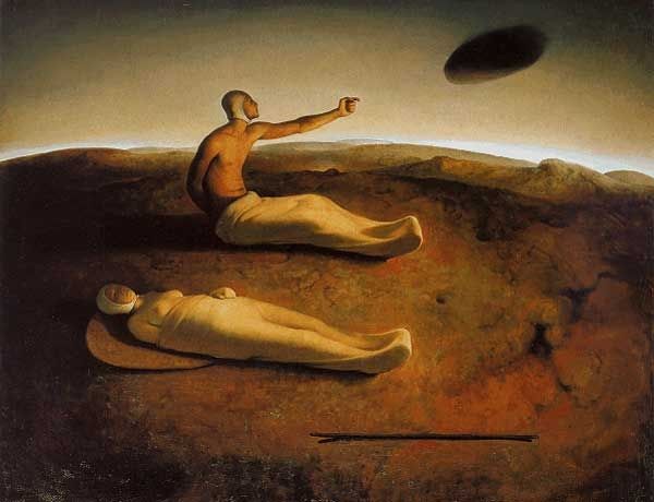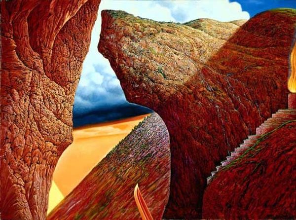 Editor: Here we have Sabin Balasa’s painting, *Exodus*, rendered in oil. The rock formations dominate the composition and frame these tiny figures. It gives me a somewhat surreal feeling; I’m wondering what to make of it all. How do you interpret this work? Curator: This painting strikes me as a powerful visual metaphor for displacement and the search for sanctuary, viewed through an expressionist lens. Consider the title, *Exodus*. What historical narratives and contemporary sociopolitical issues does that word evoke for you? Editor: Mass migration, definitely. Leaving home, often under duress. Curator: Exactly. And what do you notice about the figures themselves? Their scale, their positioning? Editor: They are so small compared to everything else, making me feel how vulnerable and exposed they are. The cavern seems to protect them, even if the figures are in motion. Curator: Balasa is positioning these individuals within a landscape that feels both protective and precarious. This relates to many people whose existences are in danger. He is emphasizing their vulnerability in relation to larger forces—political, environmental, even existential. Can you consider it an appeal to action and solidarity? Editor: I didn’t immediately connect those things, but I see what you mean. It shifts the focus from a purely aesthetic experience to something much more engaged. Curator: Art, particularly socially conscious art, rarely exists in a vacuum. What we see—the composition, the colors, the forms—are often deeply connected to the world around us and to our own lived experiences. Editor: That's really insightful. I appreciate how you linked the visual elements to broader sociopolitical themes. It gives the artwork a completely different weight. Curator: And hopefully inspires you to continue exploring art with these intersectional considerations in mind.