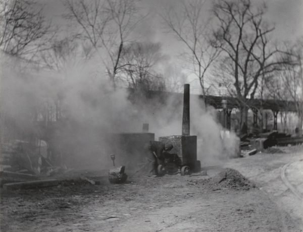 This photograph, "The Street Paver," was captured by Alfred Stieglitz sometime in the late 19th or early 20th century. The eye is immediately drawn to the contrasting textures: the soft, billowing smoke against the harsh, angular lines of the cart and its contents. The composition is a study in contrasts; the man, rendered in sharp focus, stands in stark contrast to the blurred background, creating a sense of immediacy. Stieglitz, deeply involved in debates about photography as fine art, uses the camera here not just to record but to interpret. The steam softens the grim reality of the paver's labor, and the geometric shapes of the cart against the organic backdrop of the city question the role of the industrial revolution. In closing, notice how Stieglitz uses light and shadow to further abstract the scene, pushing the photograph beyond mere representation towards something more evocative and symbolic. The meaning is never fixed, but instead, becomes a lens through which we see the changing urban landscape and the human condition within it.