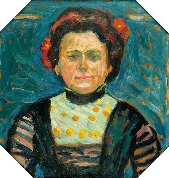 Editor: Here we have Van Gogh's "Portrait of the Artist's Mother" from 1888, rendered in oil paint. The vibrant green backdrop makes her face pop, but the overall feeling is still quite melancholic, almost ghostly, wouldn’t you say? What social or political statements do you see embedded in this piece? Curator: It's interesting that you pick up on a ghostly quality. This portrait, completed while Van Gogh was in the South of France, exists as both a deeply personal and publicly charged artwork. Remember, he painted this from a photograph after being away from his mother for quite some time, during which he was experimenting with Japanese printmaking. Can you see a similarity between the portrait and this art form? Editor: Well, now that you mention it, yes, there’s a certain flatness and boldness in the outlines, almost like a woodblock print. Curator: Precisely. And think about the socio-cultural implications. While he's painting his mother, he's also grappling with how he wants to be perceived by the Parisian art scene – should he focus on traditional subjects and art techniques? Or can a simple image of maternal love convey more? This tension reveals much about the politics of representation within the art world at that time. Do you find Van Gogh challenges this with his depiction? Editor: It definitely feels like a push and pull. I see the affection but also a detached quality because it's based on a photograph. Thanks to his distinct painting style and those sharp, unforgiving lines, it's like he's laying bare not only his mother's image, but also revealing their complex familial history. That personal revelation on canvas seems almost confrontational for the period. Curator: Exactly. This intersection of intimacy and public declaration really underscores the radical nature of much of his work. Understanding how art reflects and refracts personal and public dynamics gives us a much deeper appreciation of Van Gogh's process, don't you think? Editor: I totally agree! This deep dive into the painting definitely changed how I see Van Gogh's role as an artist.