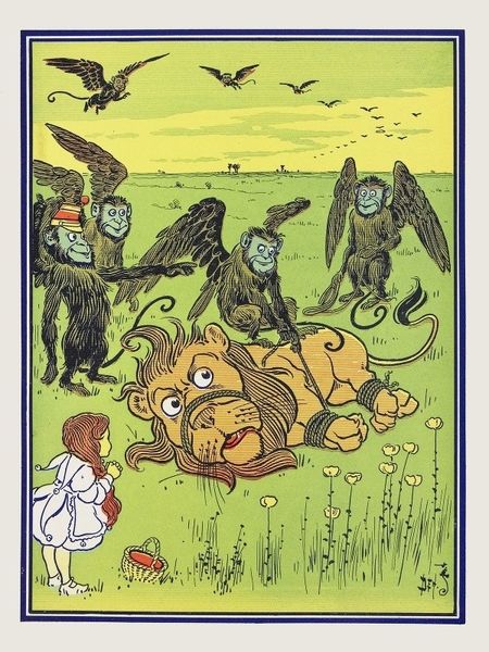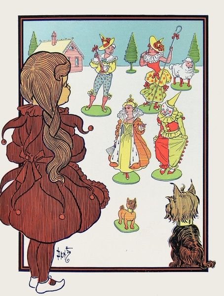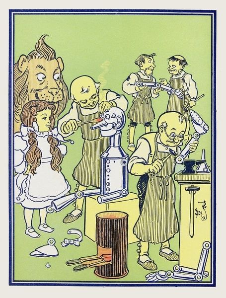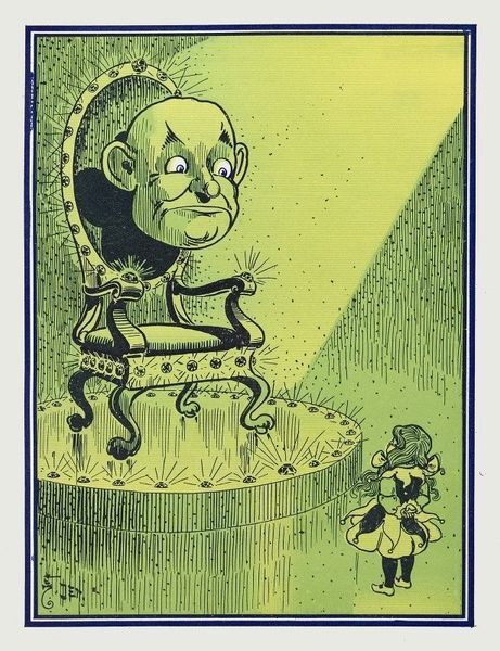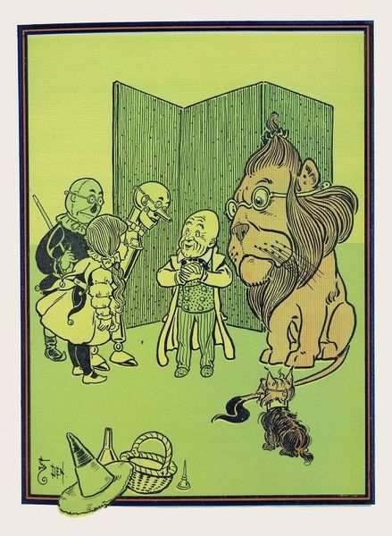 Editor: So, here we have "Permit me to introduce to you her Majesty, The Queen" created around 1900 by William Wallace Denslow. It’s a print. I'm struck by the almost mass-produced feel of the print itself, even before considering the subject matter. It feels… intentionally accessible? What do you see in the process and materiality of this work? Curator: That’s an excellent starting point. Look at the starkness of the colors, the boldness of the lines. Denslow’s choices are rooted in the mechanics of printing at the turn of the century. He embraces the means of production, highlighting the "hand-made" in industrial processes of artmaking by emphasizing linework. These artistic choices democratize visual storytelling in a way previously unavailable; note the use of popular subject matter like comic illustration with the subject, and this would appeal to many folks regardless of high brow interests in “art”. Editor: So, it's not just *about* accessibility, the choices were intrinsically *driven* by those industrial processes? The materiality isn't secondary, it's almost… foundational? Curator: Precisely! This wasn't oil on canvas destined for a wealthy collector. This was an engagement with broader society, a playful dialogue driven by both artistic choices and the limitations—or, better yet, possibilities—of print technology. Even the fairy-tale subject nods to mass consumption; and how we find shared meanings, narratives, from what's available. Editor: So, the image isn’t just a story; it tells the story of *how* stories were starting to be disseminated. It's reflecting the means of cultural production right there in the image itself. That’s fascinating. Curator: Exactly. Denslow uses what’s available to him; he elevates accessible practices by placing this kind of materiality into art, as it may appeal to children as well as adults looking to consume visually and for story! Editor: I see the work with new eyes now. What I originally considered simplistic is actually pretty revolutionary regarding production! Curator: And hopefully, that sparks questions regarding today’s media-driven art, too! Always keep looking for that interplay of production, process, material, and intent.