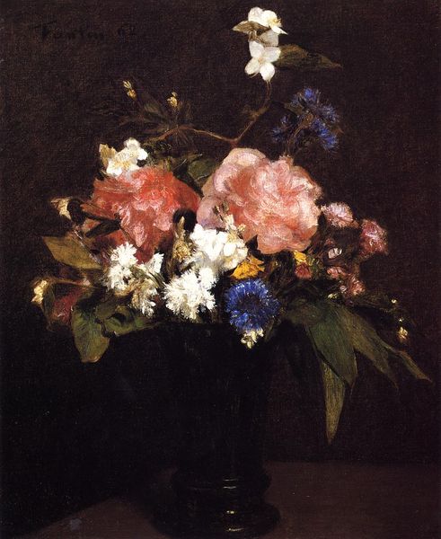 Curator: Standing here, I'm reminded of secrets whispered in dimly lit rooms. What’s your take on this work? Editor: There’s an immediate drama, isn’t there? That deep, almost cavernous background really makes the flowers leap out, a bit like a stage bathed in light. Curator: Indeed. We’re looking at Henri Fantin-Latour’s “Flowers,” from 1863. Executed with oil paints. Fantin-Latour, while embracing photography, devoted himself almost religiously to still-life paintings of flowers. Editor: You know, there's something about these paintings – flowers forever captured just as they teeter on the edge of decay, brimming, swollen, full. And it reminds me a lot of vanitas symbolism... All this vibrant life framed by the imminence of its fading. Curator: Spot on! Fantin-Latour certainly straddled a curious line—grounded in realism yet infused with a romantic, almost dreamlike quality. See how the textures seem almost felt, not just seen? He paints reality, but elevates it, I suppose. Editor: He definitely has an unusual mastery. It feels like a nod to past masters while pre-empting modern notions of transient beauty. Curator: And his flower paintings gained such popularity in England that they freed him from portrait commissions, which he allegedly disliked intensely, wasn’t very good at, and loathed doing. He apparently stated to Whistler, “If I could live on my flower pieces, I would never paint another portrait.” So there you have it, these unassuming posies liberated him from a vocation that he found stifling, and perhaps he encoded that feeling, his own, within it, using that symbolism of the flowers as a statement. Editor: Right. When you know how he struggled with those society portraits, the symbolism is all the more telling. He managed to cultivate the transience of life and fleeting beauty, or vice versa. What do you think? Curator: I think they capture moments of beauty, then gone. So you grab onto them to recall later, when memory is vague. Fantin-Latour is whispering: “Remember!”