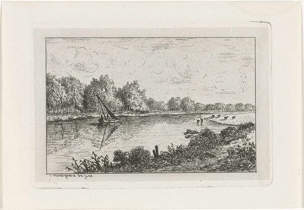 Editor: This is "Zeilboot op een rivier," or "Sailboat on a River," an etching and ink drawing created around 1856 by Joseph Hartogensis. It feels so serene and timeless, a little like stepping back into a simpler era. What draws your eye when you look at it? Curator: The sailboat becomes almost a hieroglyph, doesn’t it? Think of vessels in ancient myth – carrying souls across the River Styx, or laden with treasures of the afterlife. Even here, the sailboat, despite the pastoral setting, echoes journeys, transitions. Notice how the artist mirrored the vessel in the water. Can you tell me, what that makes you think of? Editor: A reflection—literally! I mean, water always reflects, but is it deeper than that? Is there something about reflecting the sailboat that is meant to symbolize something about the self? Curator: Perhaps. And consider that water itself is such a rich symbol. Think about baptism, cleansing, the unconscious. Doesn’t this idyllic scene evoke a sense of peace and quiet contemplation but maybe there are darker depths, things we do not perceive right away. The scene with livestock feels naturalistic; and it makes the presence of people – inside the boat - all the more pressing. Are they one of them, of the village or another passing through? What about the relationship with nature versus humans’ ambition to pass by it? Editor: It's amazing how a seemingly simple landscape can be so loaded with meaning, but what about style? How can Realism in art speak to cultural memory? Curator: Realism in this case invites viewers into a familiar scene – perhaps reminiscent of their own locales, yet also filtered through cultural memory of similar scenes depicted over centuries. Editor: That gives me a new appreciation for landscape art. There's more than meets the eye! Curator: Indeed. The cultural memory resides even in the most seemingly mundane details.