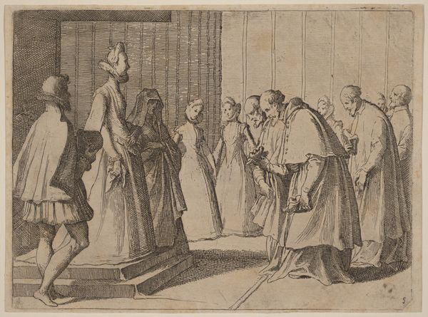 Curator: What a fascinating, almost spectral scene! It’s titled "Meeting Between a Pope and Doge," an etching created by Giovanni Battista Tiepolo sometime between 1696 and 1770. Editor: My first impression is one of careful, deliberate gesture. Each figure, even in the background, seems keenly aware of their role in this exchange. A frozen moment heavy with historical significance. Curator: Absolutely. Tiepolo often used etchings to disseminate his ideas quickly and broadly, and depictions of authority were a savvy way to garner attention. The Doge, the elected ruler of Venice, meeting the Pope, the head of the Catholic Church – that would resonate widely across cultural, political, and religious spheres. Editor: Indeed. And note how Tiepolo uses the converging lines and postures to focus the gaze right where their hands are reaching to each other: pure symbolic power is in that touch. What stories are silently exchanged there, eh? All the issues of divine authority against the might of worldly power… Curator: Or a dance of diplomacy perhaps. Etchings like these became vital tools for public instruction, creating visual narratives around the powerful figures who shaped events. Tiepolo likely intended to convey Venice’s continued relevance on the international stage by capturing moments of engagement with the papacy. Editor: But why this frozen interaction and this medium in this subdued key? Maybe he's implying the fragile nature of such moments of convergence, eh? Even on paper such meeting appears as solemn, etched for posterity. Curator: I'm wondering if he saw some particular social commentary there: Venice would eventually decline from that position. Editor: That might be so, with those fragile lines creating a narrative loaded with multiple interpretations, like echoes in a grand hall, even the humblest tool becomes potent to express that! Curator: It just goes to show the lasting power of images to provoke thought long after the moment they depict.