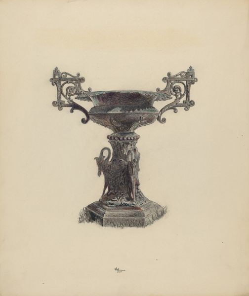 Frank M. Keane made this watercolor of a silver vase, and the way the color is laid down, it feels like he's thinking through how light defines form. Look at how he teases out the silver, not with a solid block of color, but with delicate washes of blues and purples. There's a tenderness to it, an almost hesitant touch that makes the metallic surface feel alive and breathing. It’s like he’s trying to capture not just the look of silver, but its essence, the way it plays with light and shadow. The gold accents pop because of the contrast with the cool tones, but they don’t overwhelm; they add a touch of warmth and luxury to the piece. It reminds me a bit of James McNeill Whistler's atmospheric studies, where the subject is less about exact representation and more about capturing a mood, a feeling. This vase isn't just an object; it's an exploration of color, light, and the quiet beauty of everyday things.