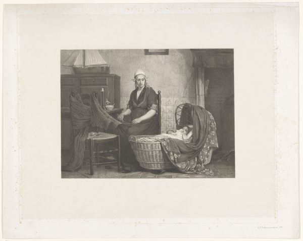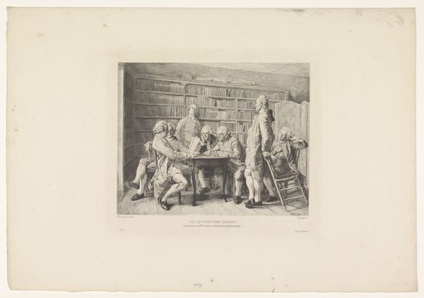 Editor: This is Édouard Taurel’s 1850 engraving, "Willem Barendsz and Jacob van Heemskerck," currently held at the Rijksmuseum. I’m struck by the composition - the explorers hunched over a globe, a stark contrast to the vast landscapes they braved. What stands out to you? Curator: Immediately, I see the visual language speaks volumes. Note how the artist places Barendsz seated, writing, almost introspective, versus Heemskerck who is standing, hand on the globe. Do you sense the implication of different roles? Editor: Perhaps Barendsz as the scholar and Heemskerck as the active leader? Curator: Precisely! Beyond individual roles, let’s think symbolically. The globe isn't merely a geographical tool; it embodies the entirety of the known world. Observe the light. How does Taurel use shadow and illumination here to create depth but also drama? Editor: The light is definitely focused on the globe and their faces, leaving the fur and model ship in shadow, which enhances the drama. What about the other items in the image? Curator: Consider the fur hanging on the wall and the ship model: these elements act as potent cultural symbols linking these men to the Arctic exploration and to navigation generally. But also as symbols of the cost of expansion. Do you feel it conveys the risks associated with those explorations? The personal sacrifices, even? Editor: Now that you mention it, there’s an undercurrent of somberness here. Curator: Indeed. The imagery encapsulates not just the physical journey but also the psychological weight of charting the unknown. What do you feel these visual cues leave you to consider regarding cultural memory and legacy? Editor: It makes me consider the impact of their voyages and the consequences, intended or not, on the places and people they encountered. Curator: A very astute observation! I’m pleased to share space to make such connections!