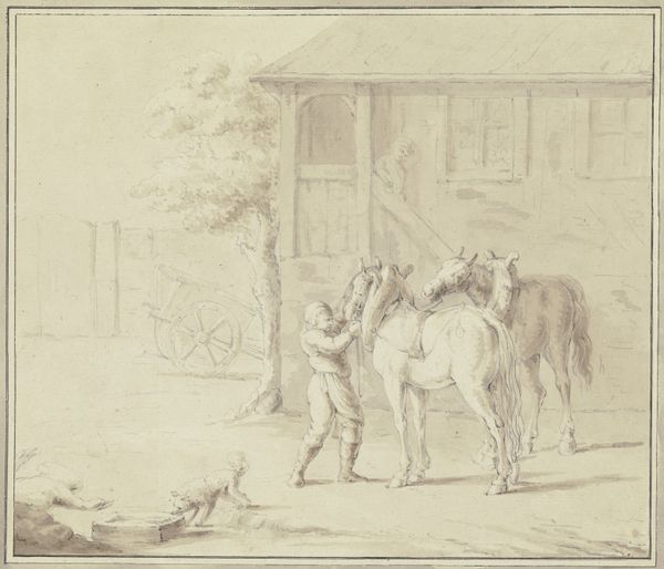 Georg Philipp Rugendas created this etching titled 'Ruiter spreekt met een man die bij zijn paard staat' sometime between the late 17th and early 18th century. Rugendas, who lived from 1666 to 1742, worked during a period of significant social stratification, and his art often depicted scenes reflective of the era's hierarchical structure. This work captures a seemingly commonplace interaction, yet the dynamics of power and status are palpable. Note the embodied difference between the seated rider and the man on foot. The rider, elevated both literally and figuratively, engages with the man who stands beside his horse. This positioning subtly underscores the social distance between them. The standing man, possibly a merchant or traveler, appears to be seeking direction or perhaps offering services. The backdrop of what seems to be a dilapidated building further emphasizes the transient nature of their encounter and the socio-economic disparities of the time. Through this simple scene, Rugendas invites us to consider the unspoken dialogues of class and mobility. How do these historical power dynamics still resonate in our contemporary interactions?
