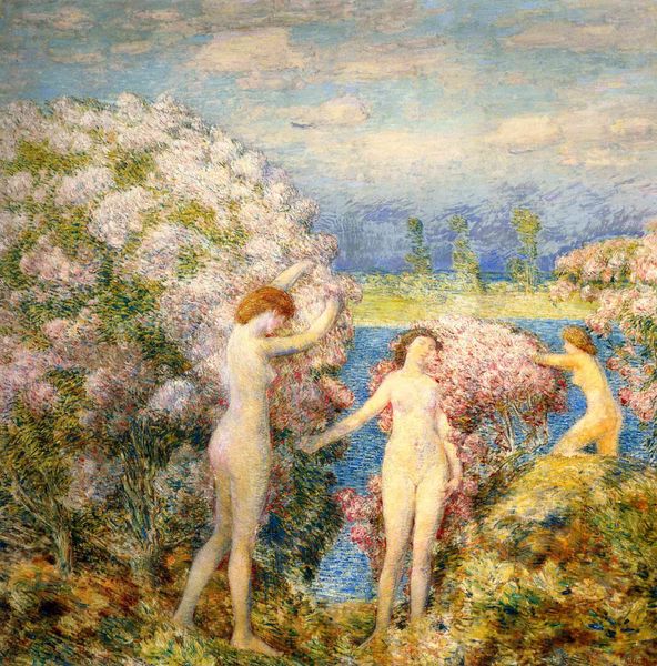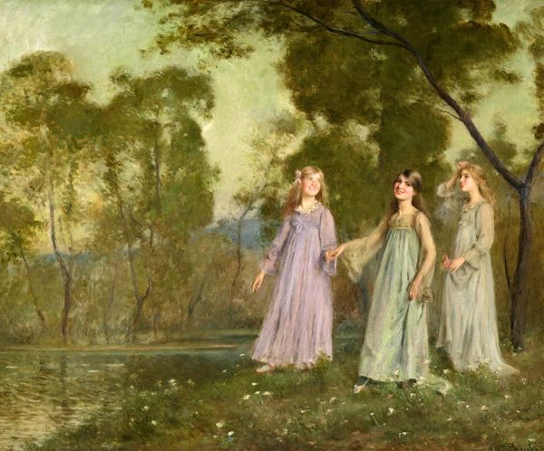 Ferdinand Leeke created this idyllic painting, Europa auf dem Stier, using oil on canvas. The composition draws us into a scene of mythological encounter on a sun-drenched meadow. The soft, diffused light bathes the figures and landscape in a gentle glow, enhancing the dreamlike atmosphere. Leeke's use of color and form creates a sense of classical beauty. The flowing lines of the women's drapery contrast with the solid form of the bull, creating a dynamic tension between movement and stability. The pastoral setting, with its lush greenery and distant vista, evokes a sense of harmony. Yet, the painting's structure invites deeper questions. What does the presence of the bull, adorned with flowers, signify? How does the gathering of women around it destabilize established meanings? The painting functions as a site where mythological narrative intersects with new ways of thinking about desire and transformation.