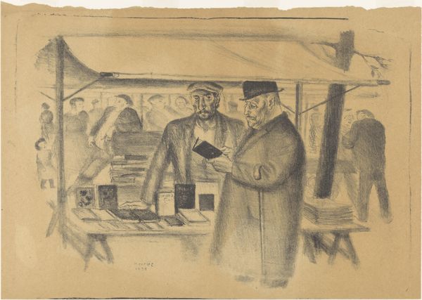 Henk Henriët created this drawing, "Boekenkraam op een markt," with pencil. Notice how the composition is structured around the stall’s angular form, creating a shallow space filled with figures and books. Henriët uses subtle tonal variations to define the forms, with darker areas establishing depth and volume, particularly in the clothing of the figures. The linear quality emphasizes the fleeting nature of the market scene. The faces are rendered with quick, expressive marks. Henriët captures a sense of momentary human activity. The figures are engaged in the simple act of browsing books, a scene that is both ordinary and charged with the potential for discovery and interaction. This drawing invites us to reflect on the transient yet profound moments of everyday life and the subtle structures that shape our perceptions and experiences. It suggests that even in the most commonplace settings, the interplay of form, line, and human presence can yield rich artistic and philosophical insights.