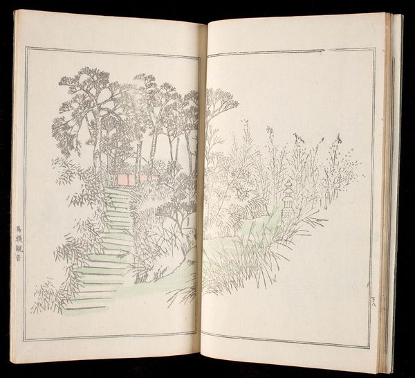 Editor: This is "One Hundred Views of Mount Fuji, Vol. 2" by Hokusai. It's a book, and this particular image feels almost like a secret glimpse of Mount Fuji through the bamboo. What symbols do you see at play here? Curator: The bamboo, like Fuji itself, are powerful symbols. Bamboo represents resilience, flexibility, and longevity, deeply rooted in East Asian cultures. Notice how Fuji is almost hidden; what does that evoke? Editor: A sense of reverence, maybe? Like something sacred glimpsed through the everyday. Curator: Precisely. The obscured view amplifies Fuji’s symbolic weight. It becomes less about the mountain as a physical entity, and more about its cultural and spiritual significance. We might even say it reflects the power of suggestion, the art of revealing through concealment. Editor: I never thought about it that way. It's fascinating how the bamboo frames not just the mountain, but also our understanding of it. Curator: Indeed. It reveals how deeply embedded cultural memory is within these images.