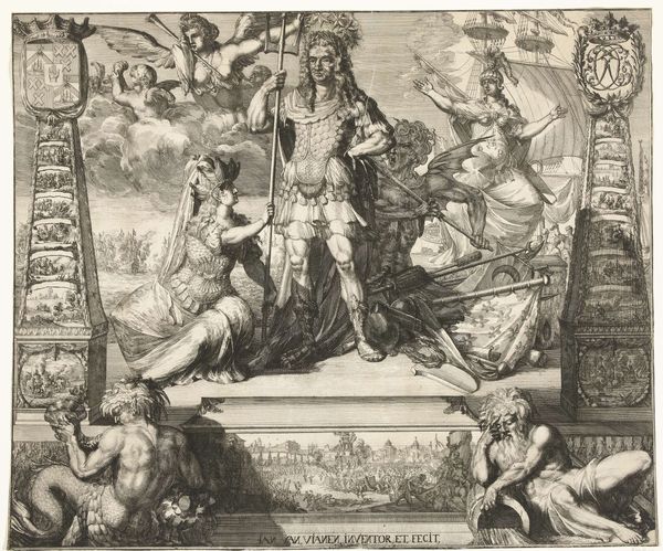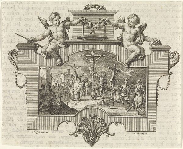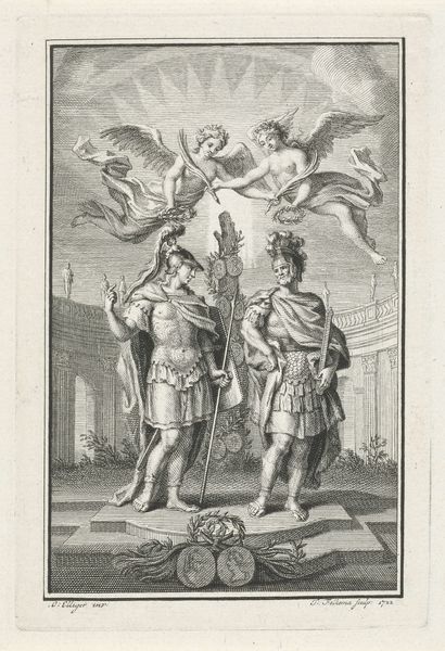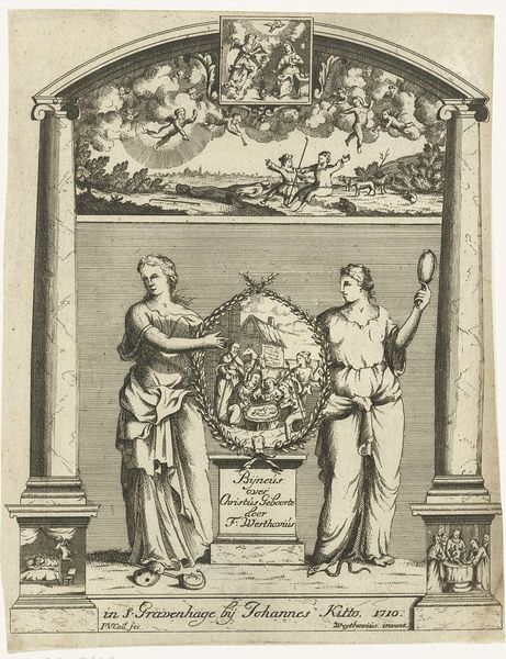 Editor: Here we have Jan Ruyter's engraving from 1735, "Titelvignet voor de titelprent van het toneelstuk 'Boerekermis'," a title vignette for a play. I find the overall composition very classical, yet there's something about the central image that seems almost chaotic. What’s your take? Curator: I see a complex layering of allegorical symbols typical of the Baroque period. It presents an opportunity to examine how art served ideological functions. Given the title translates to "Peasant Fair", we need to consider who the intended audience was and how this imagery reinforces existing social hierarchies. What do you notice about the figures of Athena and Mercury framing the central image? Editor: They seem like protectors or gatekeepers to whatever is happening in the central image… a civilizing force looking down on this "Peasant Fair," perhaps? Curator: Exactly! Their presence signifies an attempt to impose order and reason on the perceived chaos of peasant life. Consider how the idealized bodies of these gods contrast with the unruly figures in the central vignette. What does this juxtaposition tell us about the power dynamics at play? Editor: It suggests that the upper classes viewed peasant life as something needing to be controlled or contained, even perhaps mocked? That's unsettling. Curator: Precisely. Remember that art in this period often reflected and reinforced existing social structures. Examining this engraving through a lens of class and power allows us to decode its underlying message. Editor: I hadn’t thought about it that way. Looking at the expressions of the central figures, I understand that contrast more fully now. It certainly shifts the work's tone. Thanks!