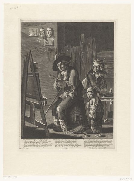 This print, titled "Poor Painter with Family in his Studio," presents a scene of domestic struggle amidst artistic endeavor. The central figure, the painter, holds his palette, surrounded by his family in evident disarray. Consider the dog in the foreground; it is a symbol that stretches back to classical antiquity, often representing fidelity but also, in more secular contexts, domestic disorder. We see variations of this motif through Renaissance paintings, such as in domestic scenes by Jan Steen, where a dog often signals a household verging on chaos. Here, the dog seems to echo the family's own chaotic state, embodying a more primal, less refined existence. Such symbols, repeated across centuries, engage with the viewer's subconscious, tapping into a shared understanding of domestic life. The artist here seems to invite us to reflect on the psychological tension between the lofty aspirations of art and the often harsh realities of life. The artist is trapped in a perpetual cycle, striving for transcendence through art, yet tethered to earthly concerns.