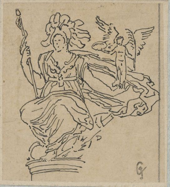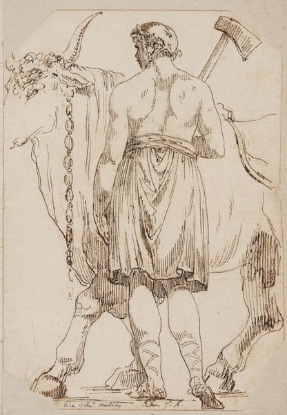 Curator: This small drawing, *Allegorical Group* by Paolo Veronese, has a raw, almost frenzied energy to it. What strikes you most about this piece? Editor: It's intense! The figure looming over the other, weapon raised... it feels like a moment of decisive power. How do you interpret this scene? Curator: To me, it speaks of the precarious balance between justice and vengeance. Veronese captures that tension beautifully. It’s as though he's asking: is this justice or simply brutality? Editor: I see what you mean. It's not a clear-cut victory; there's a disturbing ambiguity. Curator: Exactly! And notice how the loose, rapid lines contribute to the overall sense of unease. It's a masterclass in conveying emotion through form. I guess he left us something to think about! Editor: Definitely gave me a different perspective. Thanks!