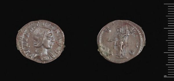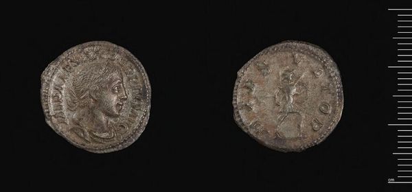 Curator: Here we have a Denarius of Julia Mamaea, a silver coin from the Roman Empire. Its weight is just over 3 grams. Editor: There's an undeniable austerity to this piece. The monochrome palette and the stoic profile render a quiet, almost melancholic mood. Curator: Coins like this served as propaganda. Julia Mamaea was a powerful woman, mother of Emperor Severus Alexander. Her image broadcasted imperial authority. Editor: Yes, but let's consider the politics of representation. The image is carefully curated to project power, yes, but also perhaps to subtly negotiate her role within the existing patriarchal structures. How much agency did she genuinely have? Curator: An excellent point. Analyzing the imagery within its socio-political moment helps us unpack these nuances. The figure on the reverse side symbolizes Felicitas, the Roman goddess of good fortune and success, and it would have been crucial to the coin's function. Editor: It's fascinating to see the intersections of gender, power, and cultural symbolism condensed onto such a small object. There’s so much to unpack here.