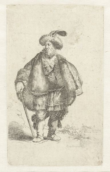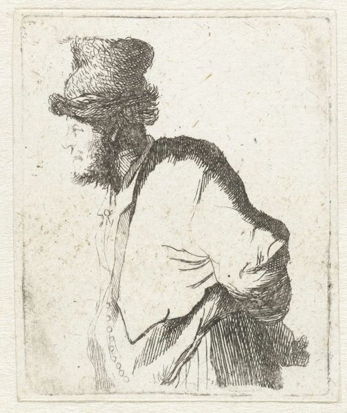 Christiaan Wilhelmus Moorrees created this print, 'Zittende krijgsman', an image dominated by cross-hatching in black ink on paper. The composition centers on a seated soldier, adorned in armor and a feathered hat, which creates a compelling study of texture and form. The cross-hatching technique gives the piece a remarkable tonal range, from the deep shadows behind the figure to the reflective surfaces of the armor. Moorrees’ use of line is particularly striking. It not only defines the contours of the soldier’s body and attire but also suggests a play of light across the metallic surfaces and soft plumage. This attention to detail invites a semiotic reading, where the armor, hat, and sword function as signs of military status and power. The overall structure of the image, with its emphasis on the materiality of both the subject and the medium, leads us to consider how Moorrees uses form to communicate ideas about identity, representation and the enduring legacy of military might.