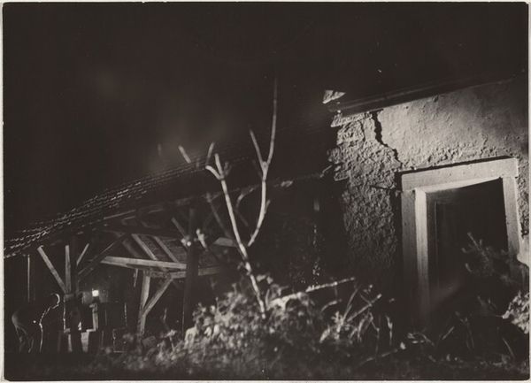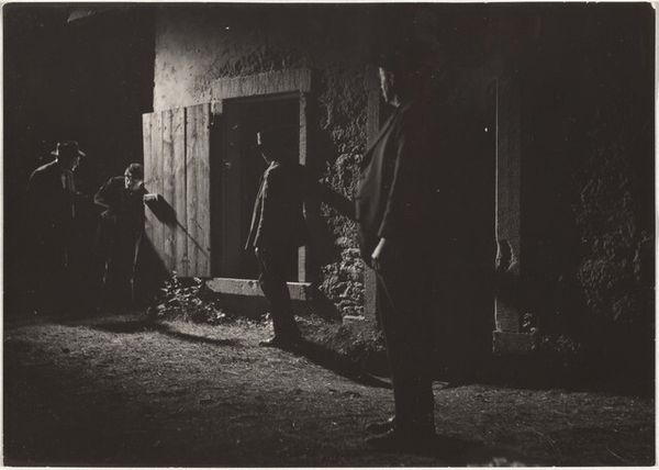 Curator: This is "Actors--Filming 'Steibruch'," a 1942 gelatin silver print by Robert Frank. It captures a scene being filmed, apparently outdoors at night, involving two men. One man kneels with a solemn look, while the other looms over him with a rifle. Editor: My first thought is how the high contrast and limited light create this heavy, almost theatrical mood. You can almost feel the tension of the moment, despite the still image. Curator: Absolutely. It is interesting to note that while Frank is celebrated for his later work exploring American culture, this earlier image already shows his strong interest in film and performance. Think about how this image functions both as a documentary photograph and a staged performance. It also seems like we're looking at labor - labor in film and performance but what other labor has produced this image? Editor: That makes me wonder about the context of the film itself. "Steibruch," translating to "Quarry," likely involved themes related to struggle or extraction. In 1942, during World War II, the film's themes may carry a significant political undertone—especially if produced in a Nazi-occupied country. Curator: The setting, possibly a constructed quarry or a theatrical set made from wooden support structures and backdrop of stones, intrigues me. You have real, unprocessed wooden poles next to fabricated structures used to convey setting. Consider what that kind of artifice may speak to, alongside the stark presence of the rifle in the photograph's narrative. It all points to very intentional construction. Editor: The men’s roles in the scene are also very compelling, which evokes complex layers of power. What stories are these roles acting out and reenacting through production, and how are they tied into the socio-political climate? Considering Robert Frank's career, with much of his later work examining disenfranchised people, it begs the question about the role of marginalized communities even within filmmaking. Curator: Thinking about the labor, it is amazing to imagine how the set materials alone inform our understanding. A photograph doesn’t just “capture” reality—the final print requires human construction and intervention to get it there. It is a perfect example of how photography and the creation of film intersect with very material means. Editor: It is thought-provoking how this image pulls apart so many layers, doesn’t it? On the one hand, a starkly lit, high contrast documentary style photo and on the other a complicated staged tableau with suggestive political implications during a tumultuous moment in modern history.