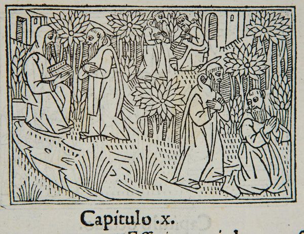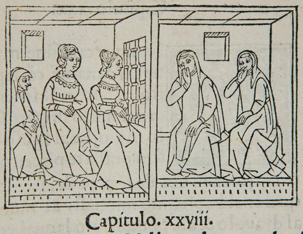 Editor: This anonymous work, "Ch. 20. On the behavior of nuns when with men and especially when speaking to them," presents a fascinating scene in stark lines. The composition divides men and women, and the contrast feels loaded. What do you see in this piece? Curator: The division is indeed central. Note the linear precision defining each figure and architectural space, a structure that emphasizes separation. Observe how line dictates form and perhaps, meaning. How does the starkness influence your understanding? Editor: It makes me feel like this division is absolute and unwavering. I’m starting to see the artist used line to create barriers, both physical and societal. Curator: Precisely. The medium's inherent qualities—its starkness and linearity—reinforce the subject's theme of division, creating a powerful visual statement. What have you learned? Editor: How formal elements can enhance the subject. Curator: Indeed, a crucial part of art.