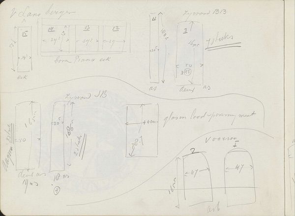 Curator: Here we have "Rechthoek," a drawing created by Carel Adolph Lion Cachet between 1905 and 1906, currently held here at the Rijksmuseum. It’s rendered in pencil and ink, and it appears to be a page from a sketchbook. Editor: It’s a bit…technical, isn't it? It looks like an architect's quick study, or maybe notes on a stage design. It definitely doesn't feel like the artist was aiming for a grand statement. More like capturing a passing thought, quickly jotted down before it disappears. Curator: Precisely! Cachet was deeply involved in decorative arts and design reform at the time. This drawing shows us how he worked through the underlying structure. It highlights the intersections between fine art and practical design elements and shows an intimate part of his creative process. The use of simple materials and geometric form reflects the influence of the era's emphasis on functionalism. Editor: Functionalism, you say. For me, the crossed-out numbers bring an immediate sense of urgency. This isn’t just a placid sketch; there’s problem-solving going on. The simple act of him calculating something right there on the paper tells a deeper story of how design and function come to be in an immediate, evolving creative act. Curator: The numerical annotations definitely enhance our insight. He may have intended to build or design something specific around this rectangle. Viewing it through a lens of architectural history highlights how practical calculations intertwined with artistic visions. Editor: Exactly. And in some ways, those imperfections are what make it so compelling. It's vulnerable, honest. More appealing to me than a perfectly rendered object. And honestly, maybe even more informative as to what goes into constructing anything whether practical or aesthetic! It sparks ideas – maybe the best art always does. Curator: A fitting reminder that behind every finished piece, every designed object, there's a process of experimentation and adaptation. Cachet invites us to witness this creative problem-solving in action, reflecting the artistic mindset of an era that championed both beauty and utility. Editor: So next time I’m lost for inspiration, I’m just going to start scribbling down flawed ideas and numbers and hope I get somewhere near as conceptually intriguing.