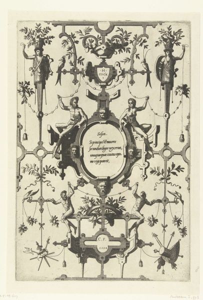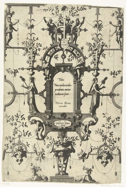 Editor: This is a print called "Ronde cartouche met tekst van Cleobulus," dating back to somewhere between 1558 and 1630, created by Johannes or Lucas van Doetechum. It's incredibly detailed. The Baroque style really makes it pop. What strikes you most about it? Curator: Oh, it's like a delicious visual puzzle, isn’t it? For me, it’s the tension. Look at the figures straining, the precarious balance of elements, that feeling of abundance verging on overload – typical of the late Renaissance fascination with the natural world and classical learning colliding head-on. It's almost bursting with meaning…Do you notice the motto in the roundel? "Dum fecunda fortuna ar/ridet, farpertire noli, / aducrfa perstrepente/ moli frangi,"… It adds another layer, doesn’t it? It almost feels like a personal motto. How do you read the image alongside those phrases? Editor: Interesting! It’s about good times not going on forever. But even in bad times you must not be broken…I guess that the image can be interpreted as a personal statement that must not get bogged down by all the adornment in order to stand the test of time, as you would in life. Curator: Exactly! It is thought-provoking, don't you think? How societal status, even the visual image must stand for more than just aesthetics, it's a story of survival too. So, you could reflect those feelings of optimism as if seeing a little secret tucked within the engraving, the idea that you can push through. What will *you* pull out from this print when you leave here today? Editor: I like what you said. It really inspires hope. I can go beyond my art history readings! Thank you for offering an introspective angle.