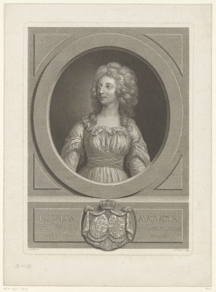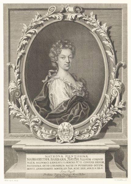 Curator: Looking at this image, I immediately sense an aura of self-possession and perhaps a hint of melancholy in the sitter’s gaze. It feels rather intimate, despite the formal presentation. Editor: Here we have an engraving from about 1675 to 1700, created by Lamberecht Causé. It's entitled "Portret van Antoinette Du Ligier de la Garde Deshoulières," housed right here at the Rijksmuseum. What initially grabs you about this piece beyond the affect in the portrait itself? Curator: The oval frame certainly dictates our gaze. We see this refined woman set within, her name inscribed like a kind of personal history circling her head. Even without knowing who she is, that contextualises a particular kind of symbolism for her status. I'm particularly drawn to the crest below too. Editor: As it happens, Antoinette Deshoulières was a celebrated French poet and philosopher, enjoying considerable fame during her lifetime. The imagery is all incredibly deliberate. Notice the laurel crown—the symbol of poetic achievement. Curator: Ah, so this is an assertion of her intellectual status, subtly coded. The pose seems less accidental now. Editor: Precisely. This isn't simply a portrait but a statement about her position in intellectual circles. The Northern Renaissance elements within the Baroque are definitely visible, in this careful balancing act. Curator: And to see her represented through this specific medium... the print, rather than a grand oil painting. It points to wider circulation of her image and ideas, her presence among a certain educated readership. A political claim. Editor: It feels, yes, a little bit radical when you consider how constricted women’s expression was back then. The image becomes a vessel, carrying these charged ideas of female intellectual agency, across borders, across time... Curator: Exactly. I look at it now and see the quiet defiance in her eyes. Editor: It gives me a renewed appreciation for these glimpses into the past – to consider how powerfully symbolism could operate as both aspiration, and protest.