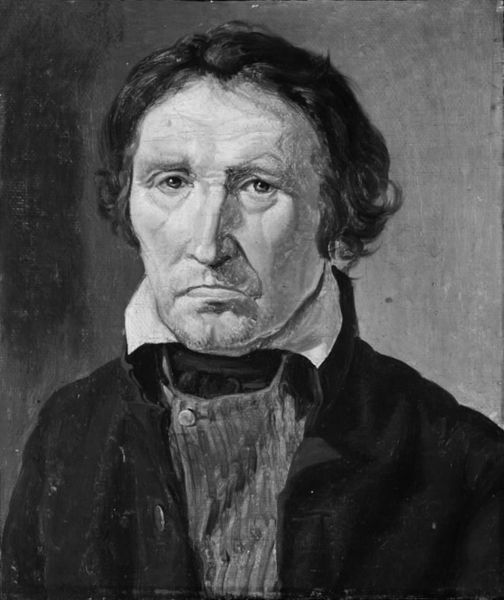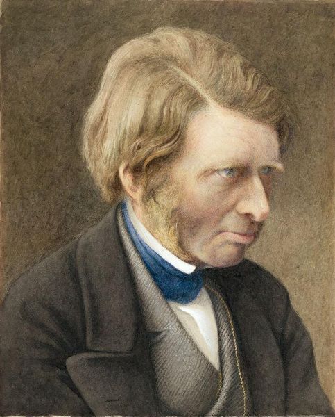 Editor: This portrait, by Charles Herbert, depicts John Ruskin. The canvas and pose give it a very somber mood. What strikes you about the composition? Curator: The subdued palette and the interplay of light and shadow across Ruskin's face are particularly compelling. Note the artist's delicate rendering of texture; the subtle gradations in the dark coat versus the smoothness of the skin. Editor: It's interesting how the dark coat almost merges with the background, drawing our attention to his face and hand. Curator: Precisely. This formal arrangement guides our eye and affects our perception of the subject's introspective state. Editor: I see what you mean. The careful structuring really dictates how we engage with the work.