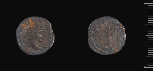 Editor: This is a coin of Alexandreia Troas under Caracalla, and it seems to be made of metal. It's incredible to hold something so old! I'm struck by the circular form and the raised relief on each side. What visual elements stand out to you? Curator: The composition adheres to the conventions of numismatic portraiture. Observe the deliberate profile, the carefully rendered texture of the emperor's hair, and the mirroring circularity. The circular shape and raised relief are intrinsic to the function and cultural significance of the object. What conclusions do you draw? Editor: I hadn't considered the functional aspect so closely. I see the formal choices now in relation to the coin's purpose. Thanks for your insight! Curator: Indeed, close attention to the material form reveals its complex cultural status.
