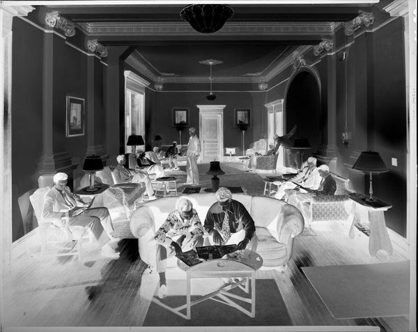 Curator: This photograph by Harris & Ewing, titled "Untitled (school girls, lounge with fireplace)," captures an intimate moment. The composition, especially given the reversed tonal qualities, creates a somewhat unsettling stillness. Editor: It really does. My first impression is one of staged, eerie calm. The figures seem frozen, almost like mannequins posed within a domestic space. Curator: The repeated motif of the girls' attire is interesting; the shared dress and caps seem to symbolize uniformity. Editor: It also brings up questions about institutionalization and the loss of individual identity within such spaces. Who were these girls, and what was the context of their lives? The image triggers a deeper conversation about the power dynamics at play. Curator: And the fireplace becomes a focal point, an almost ritualistic space within the larger scene. Editor: Yes, the fireplace, alongside the girls' matching outfits, suggests a sort of prescribed domesticity, perhaps a commentary on the expectations placed on women during that era. Curator: I find it intriguing how a simple photograph can open up such complex considerations. Editor: Absolutely, it’s a layered image that reveals much about social structures and gendered expectations.